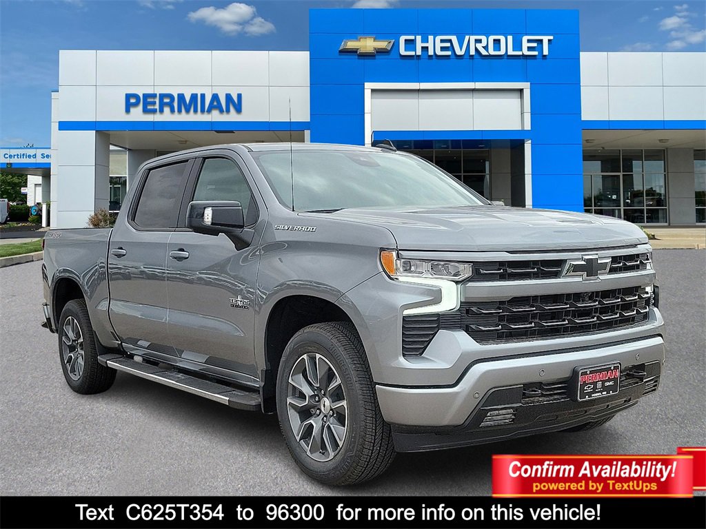 Sterling Gray Metallic 2025 Chevrolet Silverado 1500 RST 4WD 10-Speed Automatic EcoTec3 5.3L V8 10-Speed Automatic, 4WD, Black Leather.