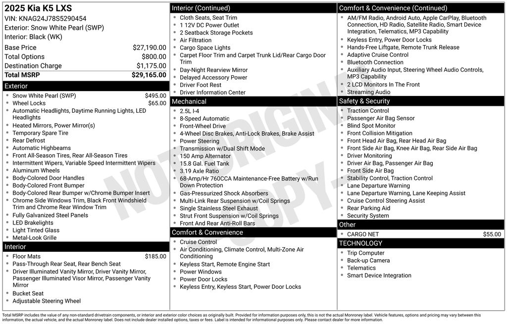 Snow White Pearl 2025 Kia K5 LXS 4D Sedan FWD 8-Speed Automatic I4 2637 CityHighway MPG